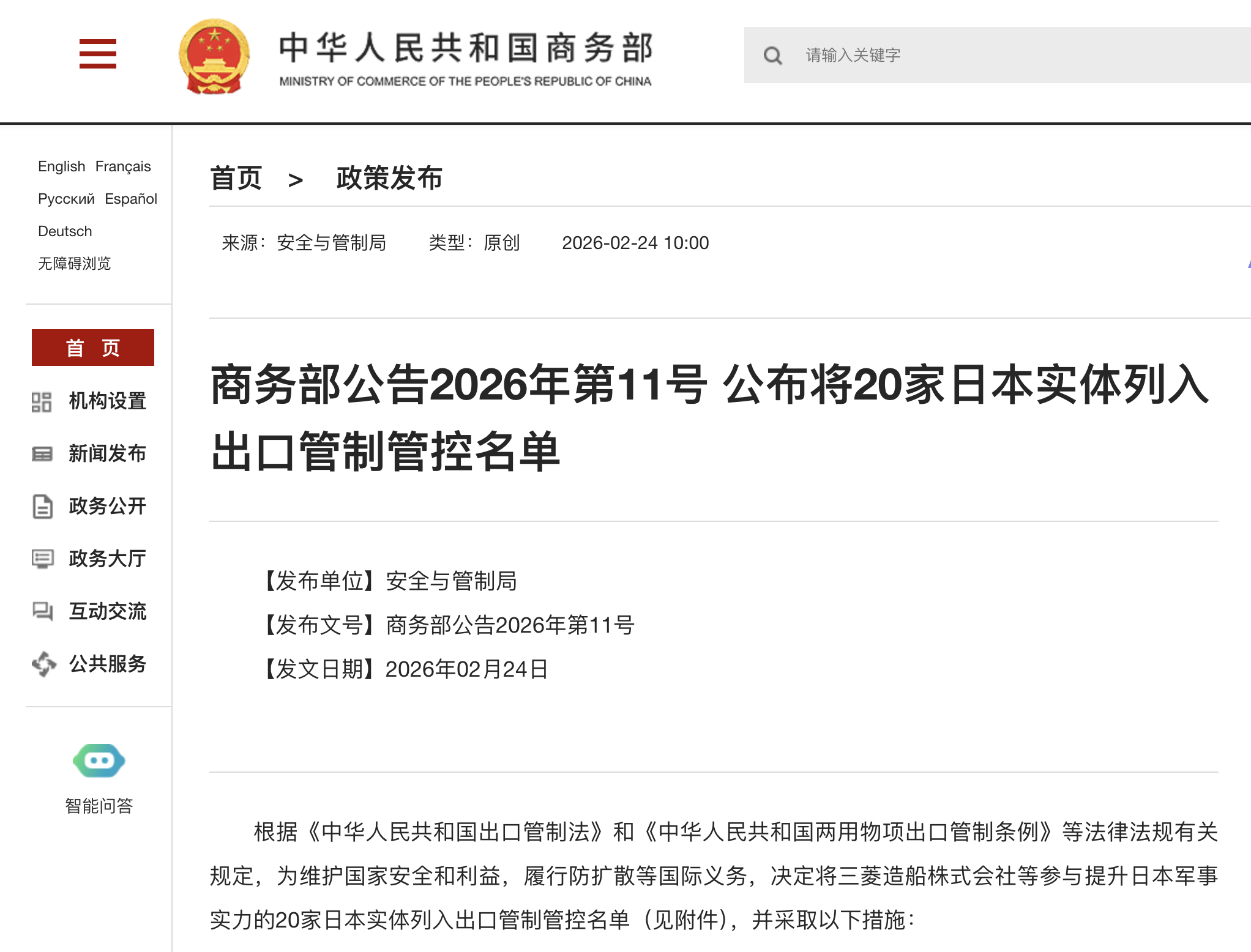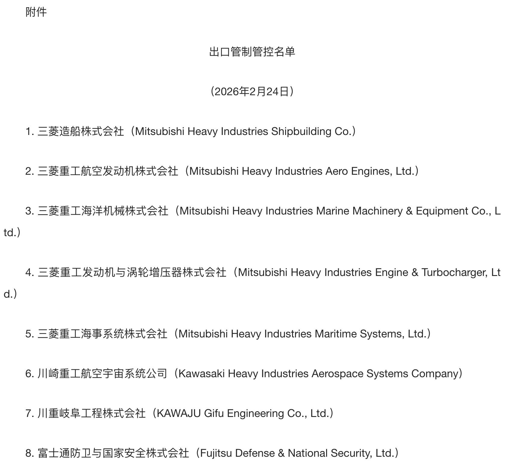 今年2月24日,中国商务部发布公告,决定将三菱造船株式会社等20家参与提升日本军事实力的日本实体列入出口管制管控名单,同时将斯巴鲁株式会社等20家无法核实两用物项最终用户与最终用途的日本实体列入关注名单。