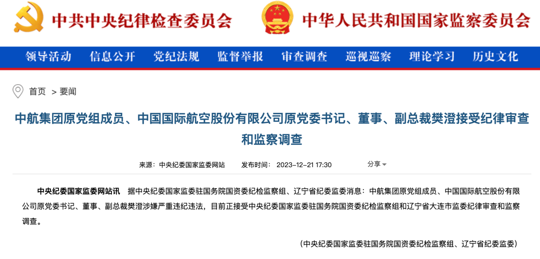 据中央纪委国家监委驻国务院国资委纪检监察组、辽宁省纪委监委消息:中航集团原党组成员、中国国际航空股份有限公司原党委书记、董事、副总裁樊澄涉嫌严重违纪违法,目前正接受中央纪委国家监委驻国务院国资委纪检监察组和辽宁省大连市监委纪律审查和监察调查。